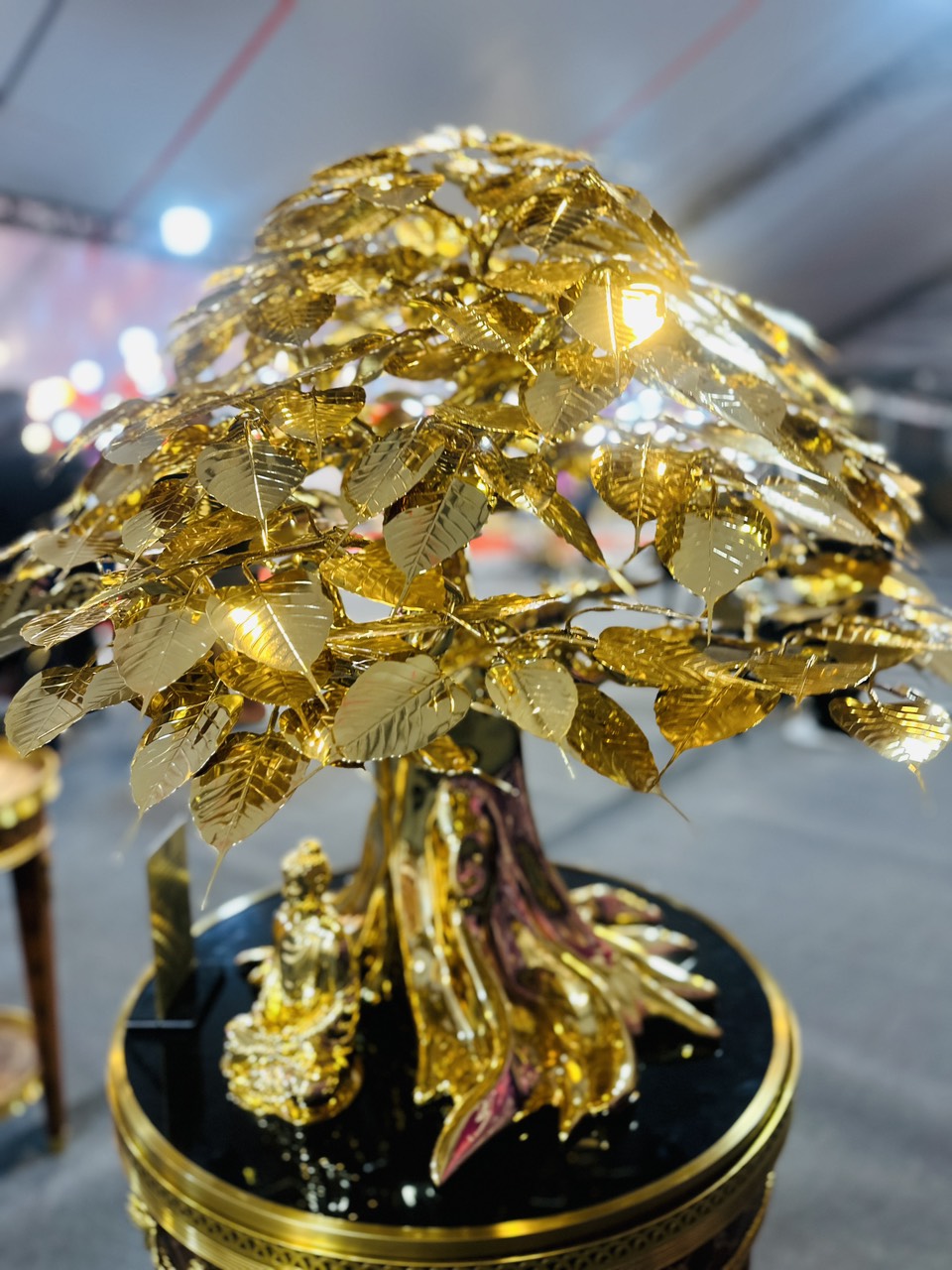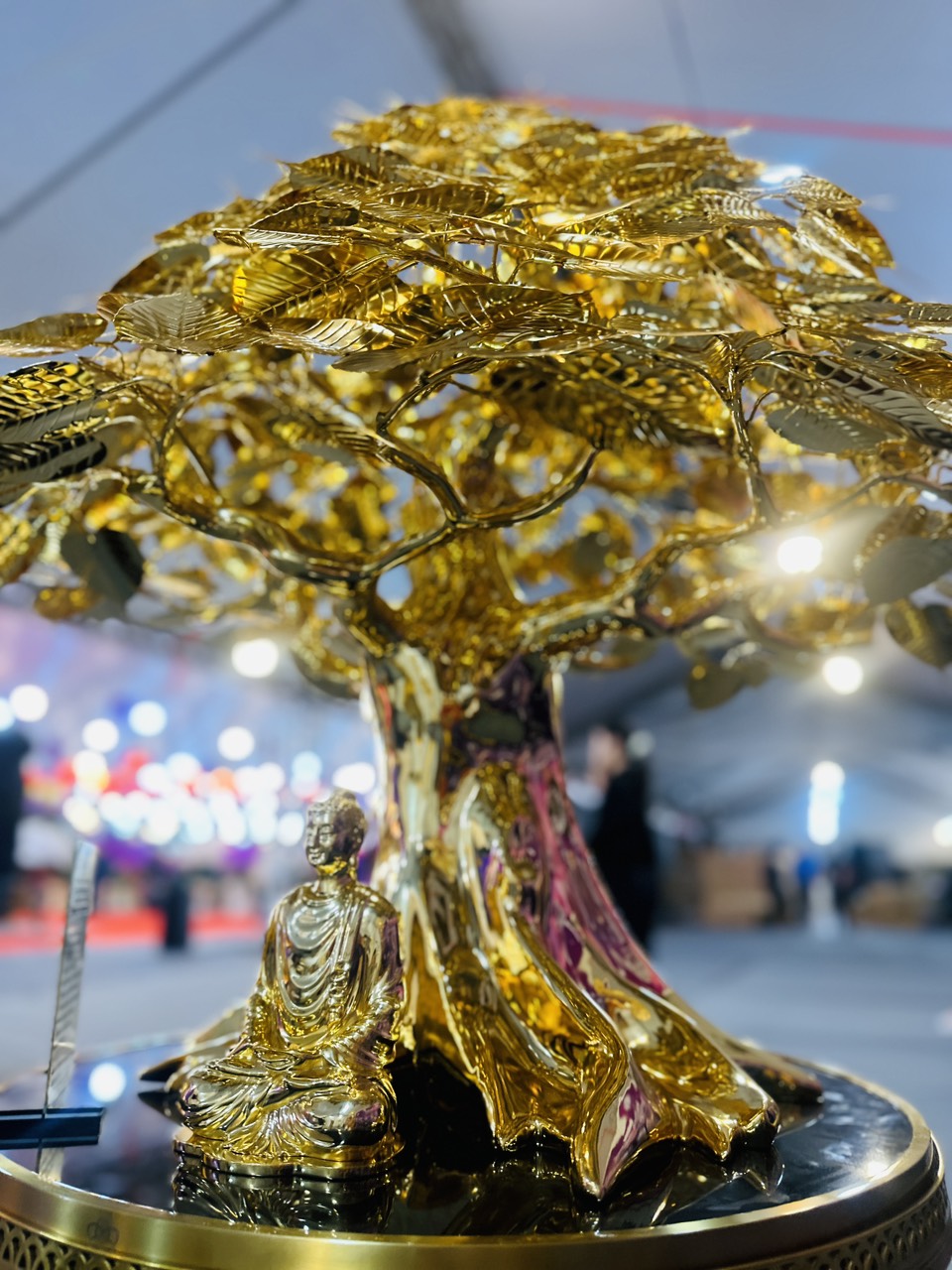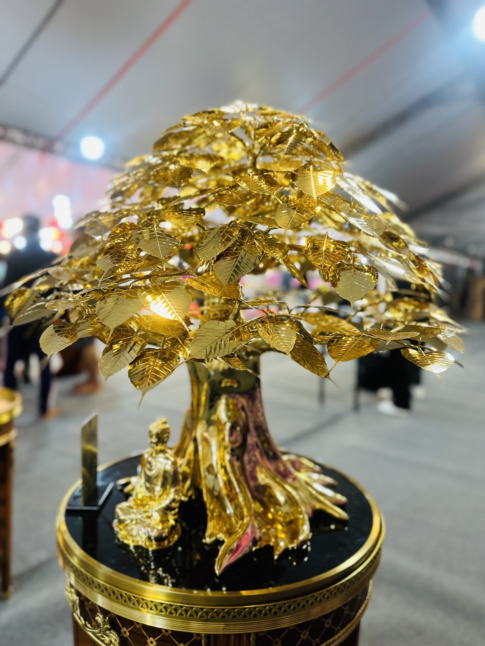 Cây Bồ Đề với những chiếc lá được chế tác thủ công và những đóa hoa tinh khôi, tạo nên một không gian tràn ngập sức sống và bình yên. Lớp phủ mạ vànglàm nổi bật từng chi tiết, tạo ra một hiện vật lộng lẫy và sang trọng.
