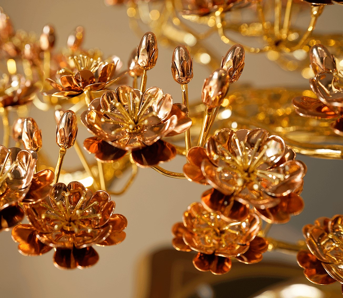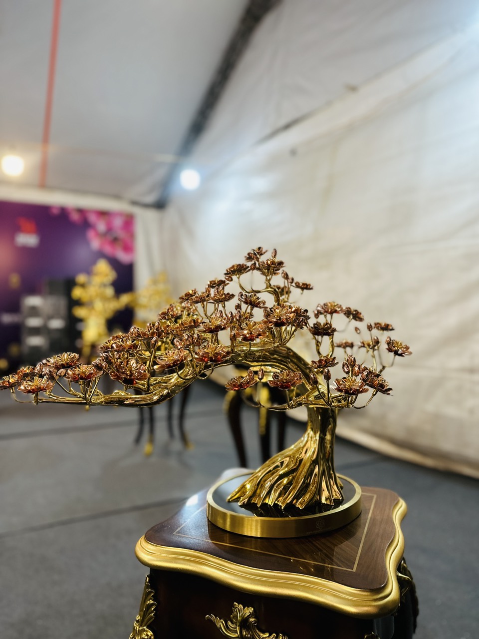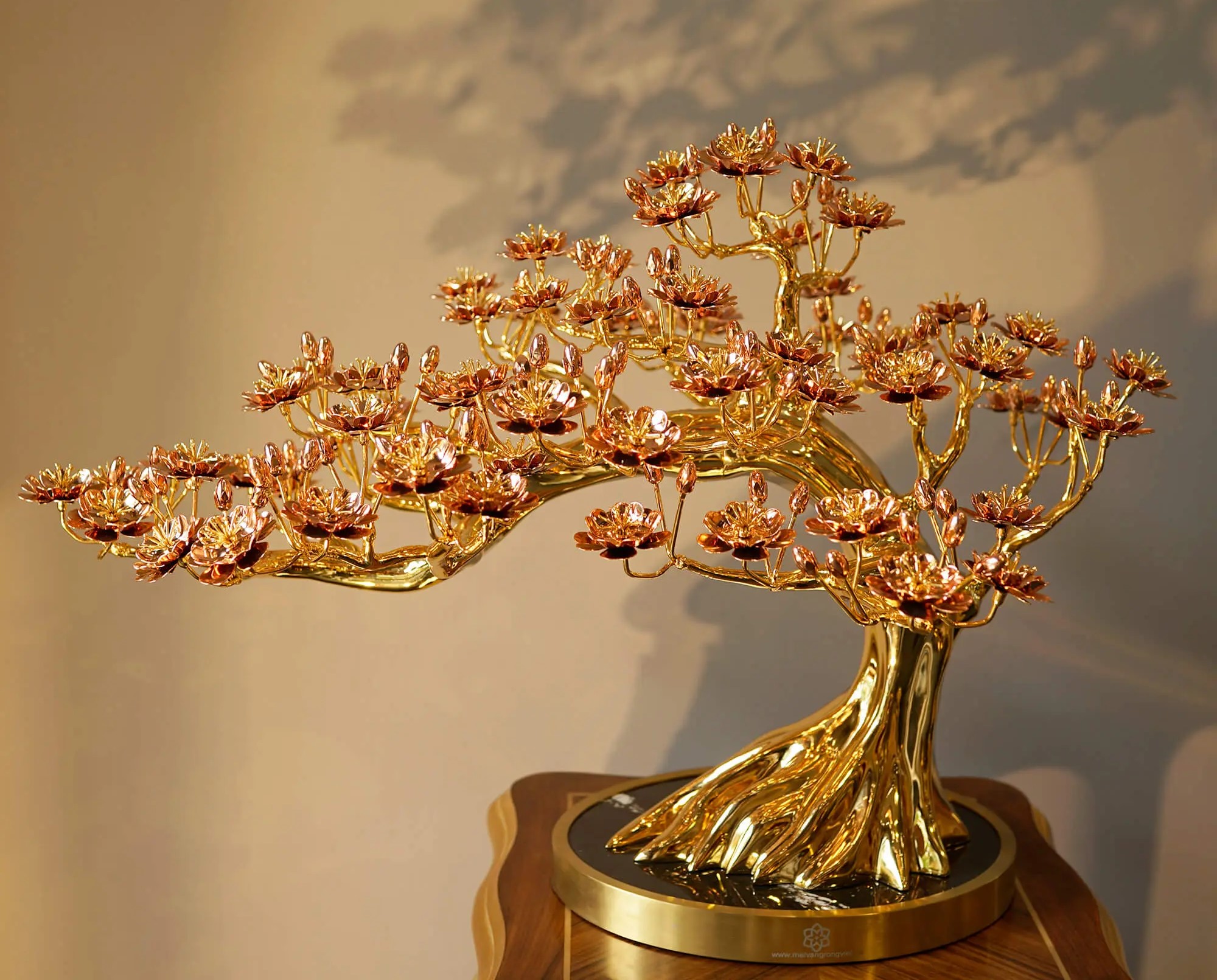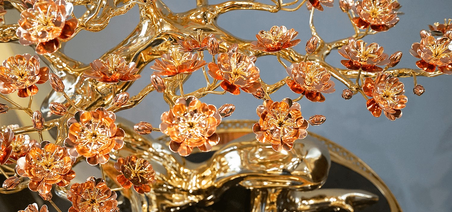 Những cánh đào mềm mại và nụ hoa e ấp được chế tác tỉ mỉ, mỗi chi tiết đều phản ánh sự tinh tế và nghệ thuật cao cấp. Với lớp phủ mạ vàng, Hoa Đào Bạt Phong trở thành điểm nhấn lộng lẫy, thu hút mọi ánh nhìn.