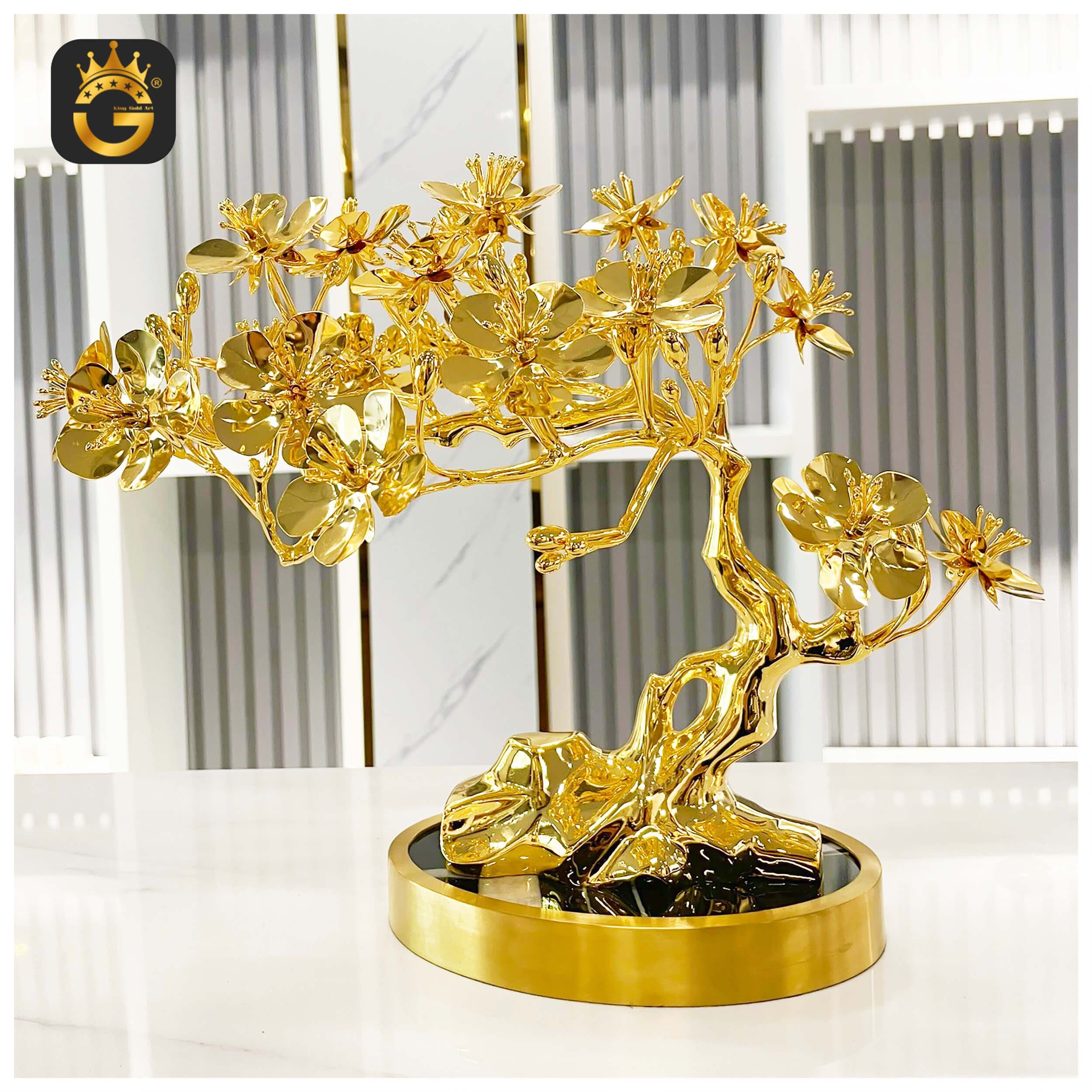 Những bông hoa mai được làm từ hợp kim đồng rồi mạ vàng 24k, mô tả hoa mai trong thời kỳ mãn khai rực rỡ nhất, tượng trưng cho những điều may mắn, hạnh phúc đang hội tụ và nở rộ. Từng chi tiết như cánh hoa, nụ hoa, nhụy hoa đều mang vẻ đẹp mềm mại tựa như hoa thật, nhờ có đôi bàn tay khéo léo của người thợ thủ công và hàng trăm giờ chế tác.