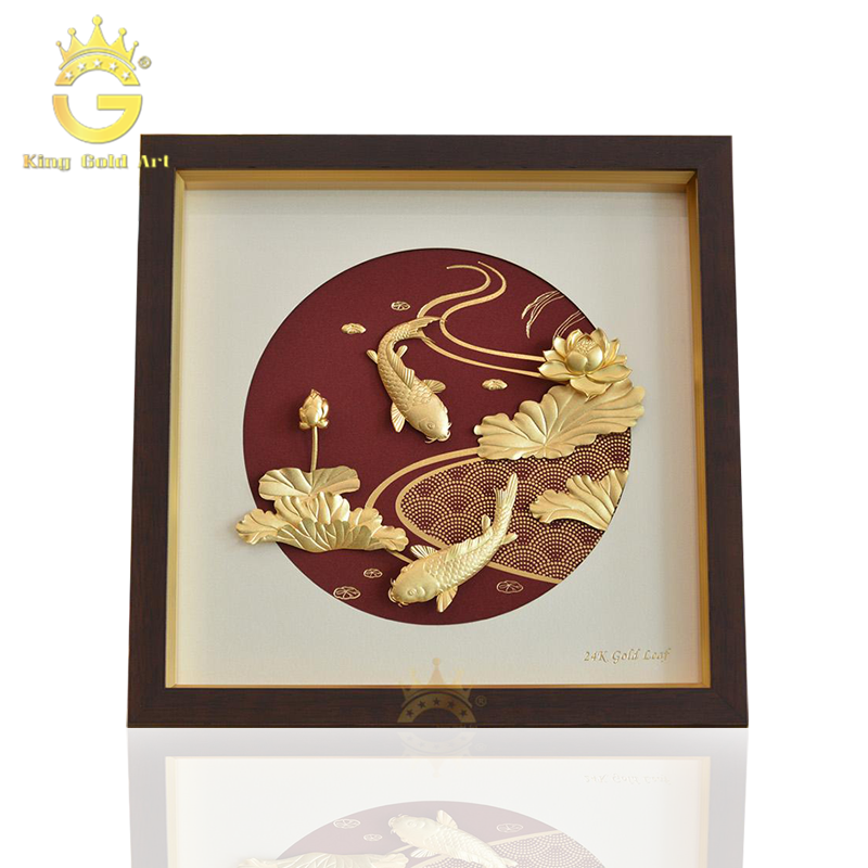 Tranh dát vàng 24k được chế tác từ những bàn tay nghệ nhân tài hoa và khéo léo. Bức tranh nổi bật với hình ảnh chủ đạo của cá chép quây quần bên những đóa sen vàng đang nở rộ. Sản phẩm ấn tượng với người nhìn bởi đường nét hoa văn vẽ hình thù cá chép, bông hoa sen nhẹ nhàng, sinh động. Đặc biệt hơn biểu tượng cá chép và hoa sen được dát vàng, mạ vàng 24k sáng bóng và tinh tế đến chừng chi tiết.
