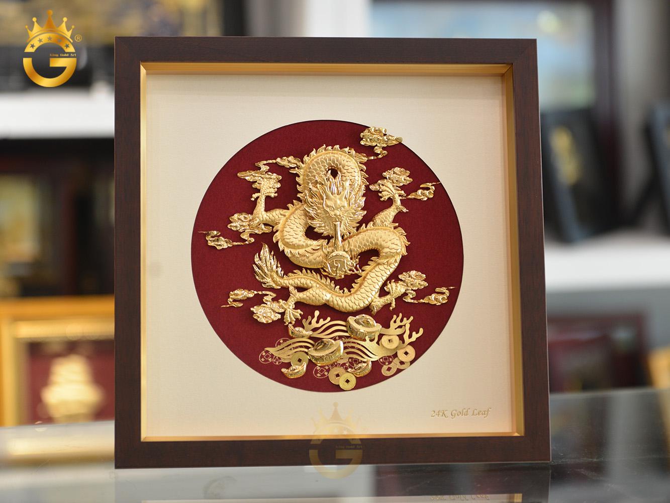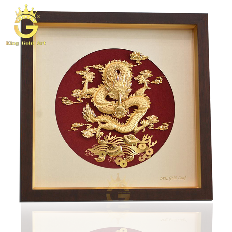 Tranh rồng vàng phú quý được chế tác bằng chất liệu Vàng 24K cao cấp. Chất liệu bằng Vàng 24K giúp đường nét của từng chiếc vảy rồng trở nên tinh xảo. Vàng được đánh nhám, tạo khối mang hiệu ứng không gian và chiều sâu cho tác phẩm.