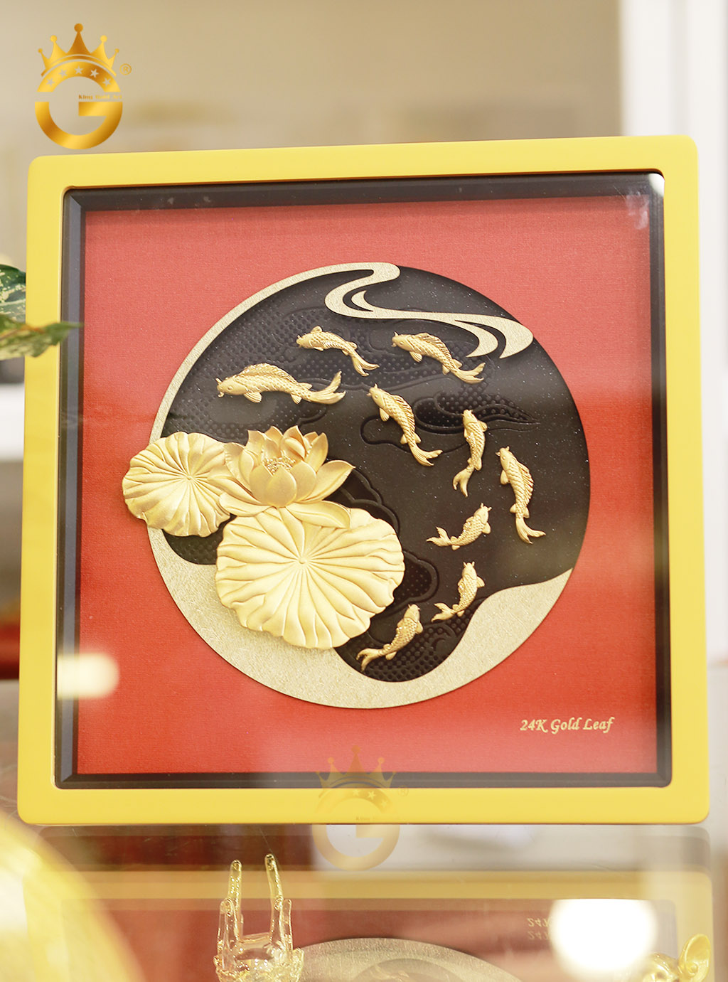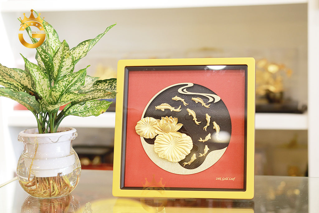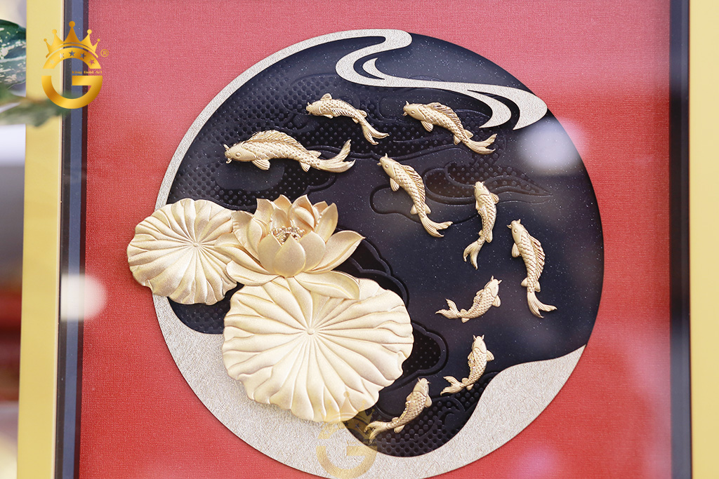 Giá trị được gửi gắm trong tranh phong thủy “Cửu ngư quần hội” không chỉ ở nghệ thuật chế tác đỉnh cao mà còn là chất liệu vàng 24K nguyên chất.