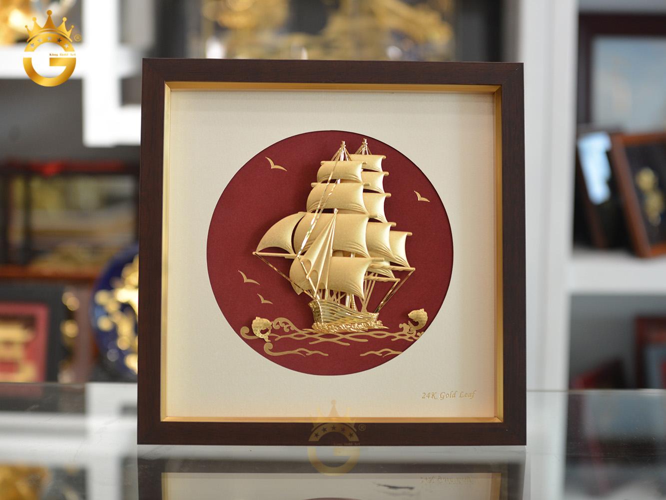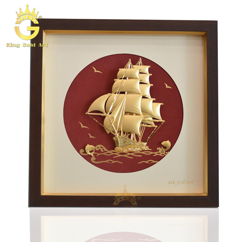 Tranh thuyền thuận buồm xuôi gió mạ vàng là một trong những dòng sản phẩm tiêu biểu của King Gold Art. Hình ảnh chiếc thuyền căng gió, mạnh mẽ vươn mình trên đại dương bao la đầy kiêu hãnh đại diện cho sự nghiệp thuận lợi, vượt lên trên những phong ba, bão tố của biển cả. Toàn bộ hình ảnh con thuyền được chế tác từ chất liệu vàng 24k cao cấp tạo nên vẻ đẹp sang trọng, tinh tế đầy ấn tượng.