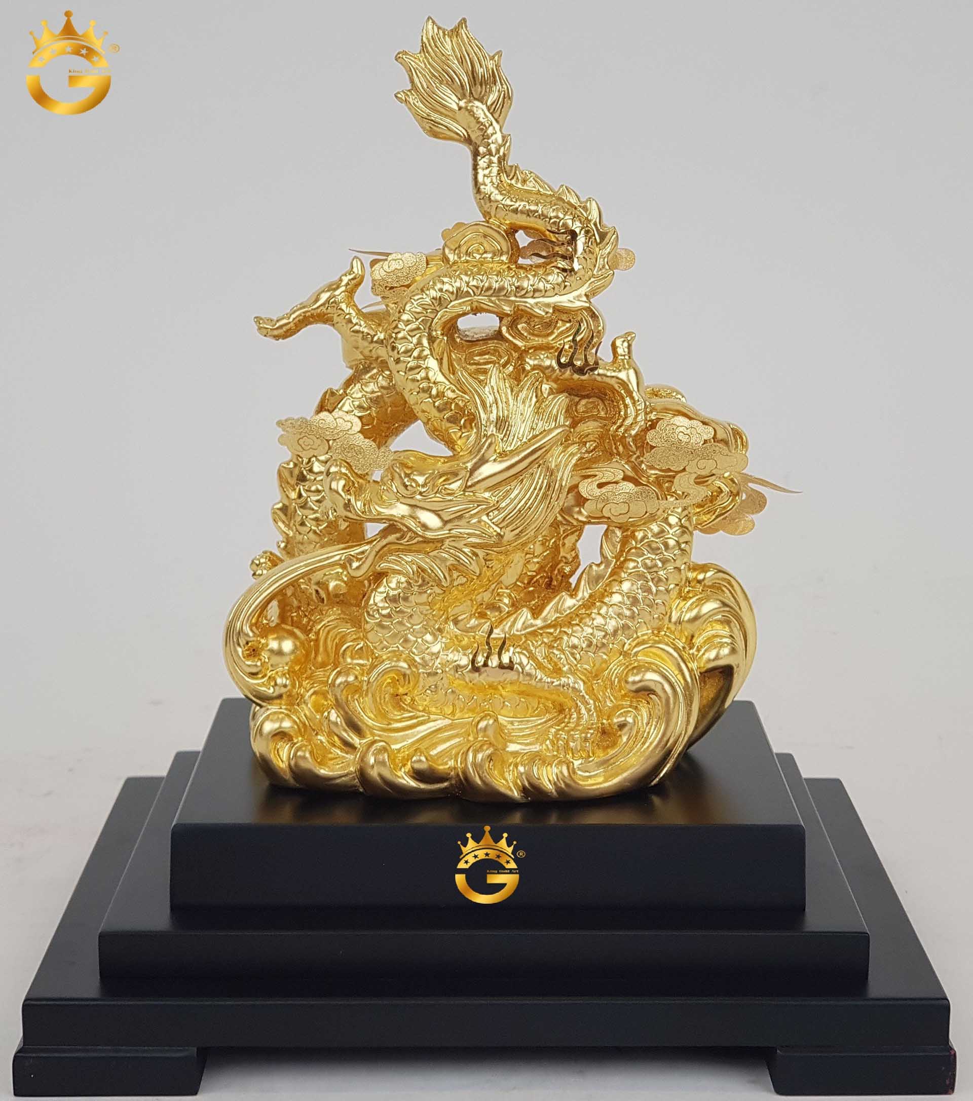 Tượng rồng vờn mây mạ vàng Tượng rồng vờn mây do KingGoldchế tác mang ý nghĩa tốt lành trong phong thủy. Hình ảnh rồng bay cao tượng trưng cho khí thế mạnh mẽ, thăng quan tiến chức và đạt những thành tựu mới. Biểu tượng rồng phun nước cũng mang đến sự no đủ, may mắn cho gia chủ.