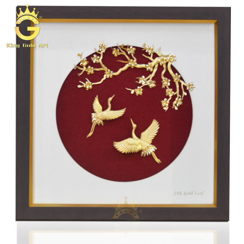 Từng chi tiết nhỏ được phủ một lớp vàng lá 24K làm cho bức tranh đôi chim hạc mạ vàng trở nên thật cuốn hút ngay từ cái nhìn đầu tiên. Mỗi một đường nét, mỗi một chi tiết trong bức tranh đều được chăm chút vô cùng kỹ lưỡng dưới đôi bàn tay tài hoa của người nghệ nhân. Phần khung gỗ bên ngoài cũng được tuyển chọn từ chất liệu gỗ tự nhiên cao cấp để tạo nên một món tặng phẩm nghệ thuật thật giá trị và tinh tế.