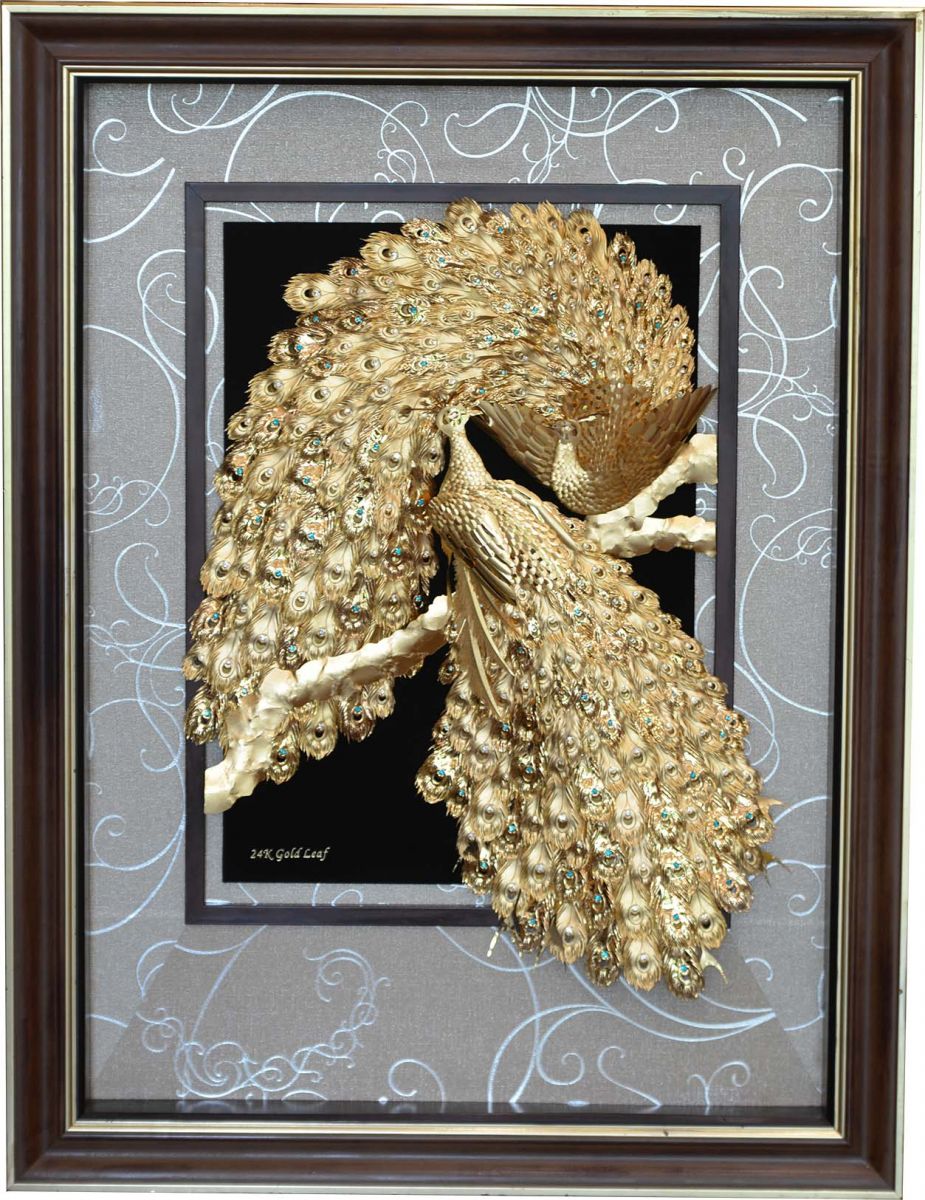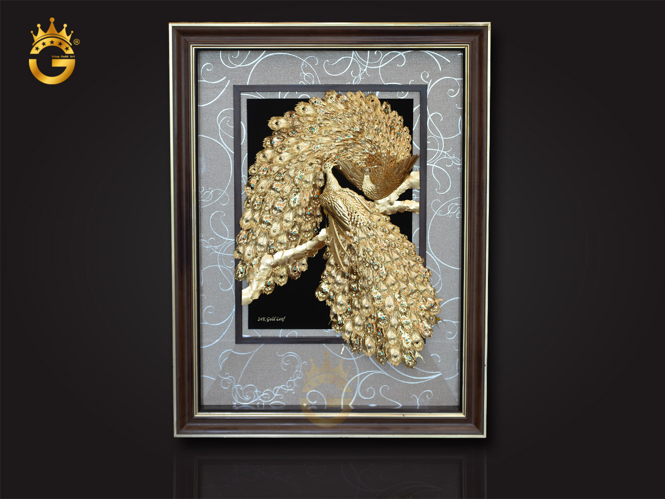 Bức tranh đôi chim công phú quý cát tường của King Gold Art là sự kết hợp hoàn hảo phần tượng dát vàng và khung kính bảo vệ. Phần đôi chim công quấn quýt nhau được dát vàng 24K sáng bóng làm bật lên đẳng cấp quý phái của người sở hữu. Phần khung kính bảo vệ được làm từ loại gỗ tốt, sơn màu nâu trầm sang trọng tương xứng với giá trị bức tranh mạ vàng.