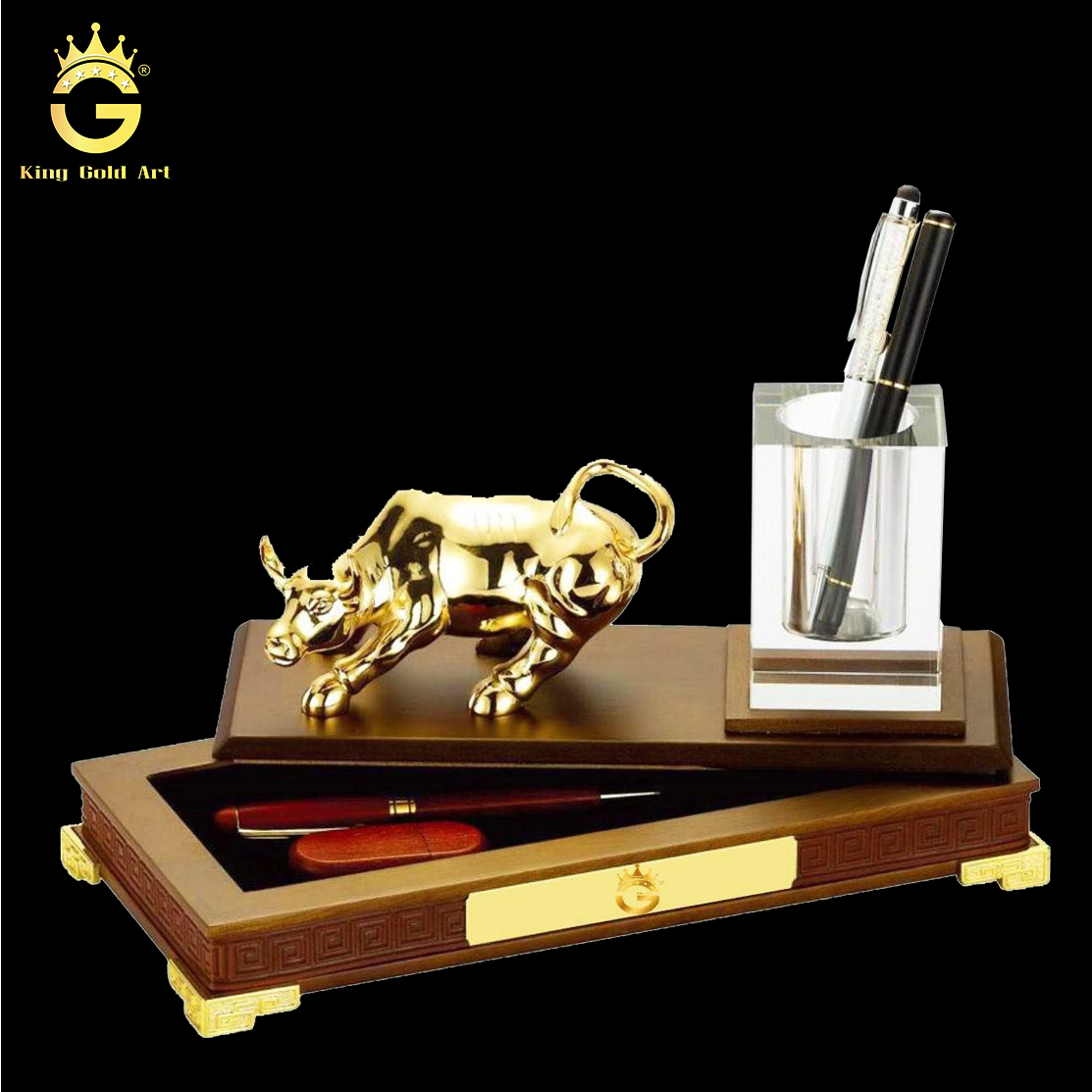 - Chất liệu: đồng đúc mạ vàng 24k, đế gỗ + pha lê đựng bút.