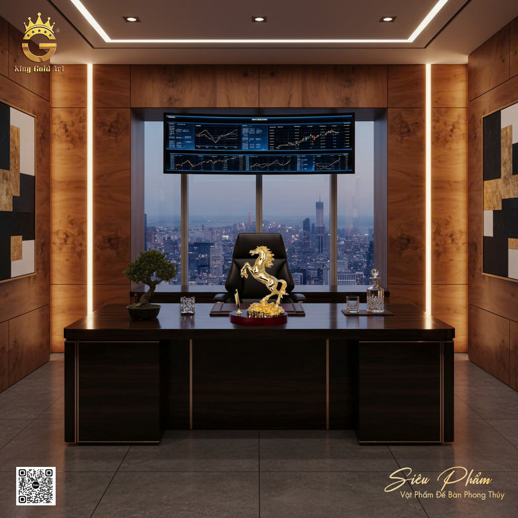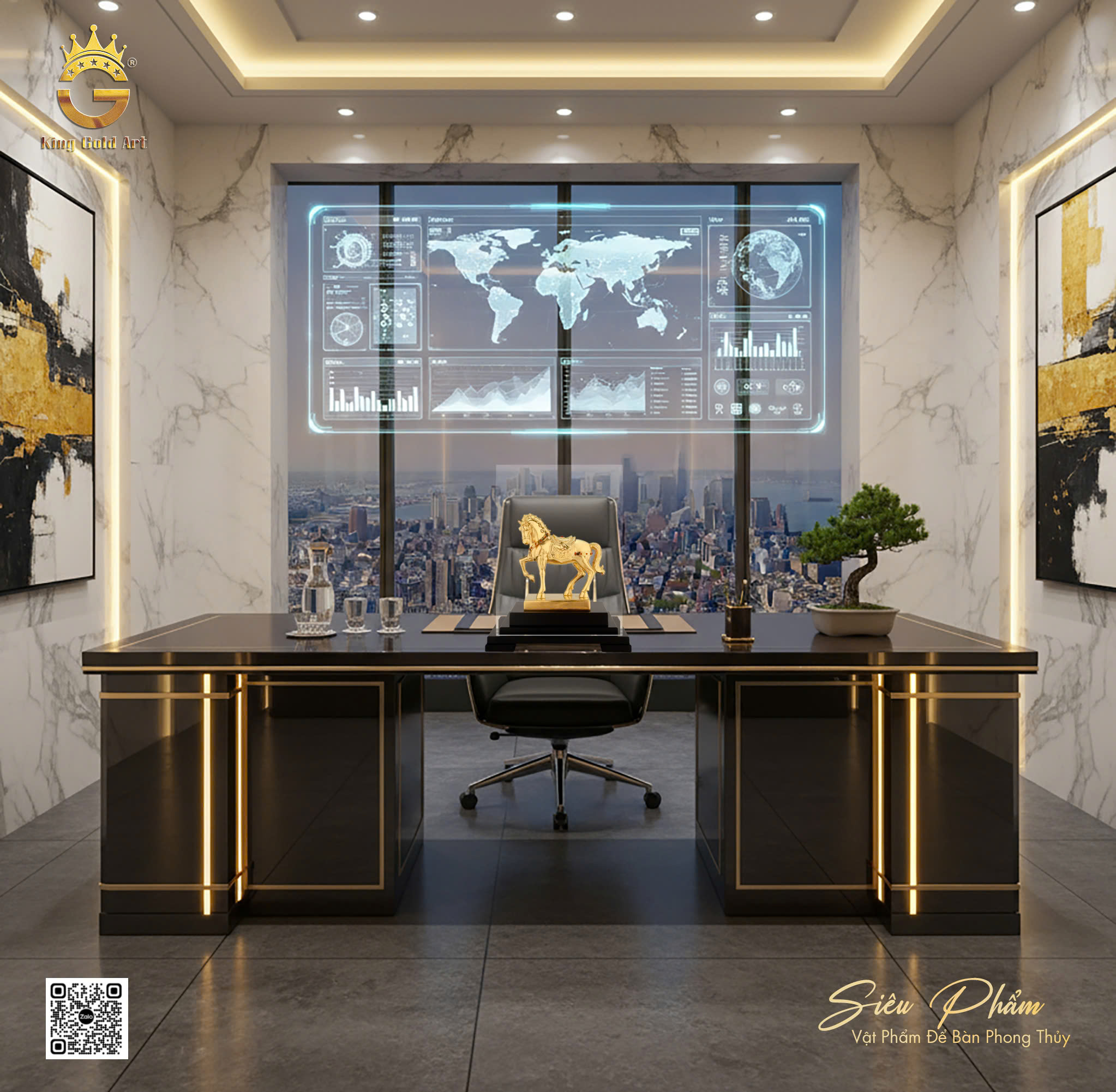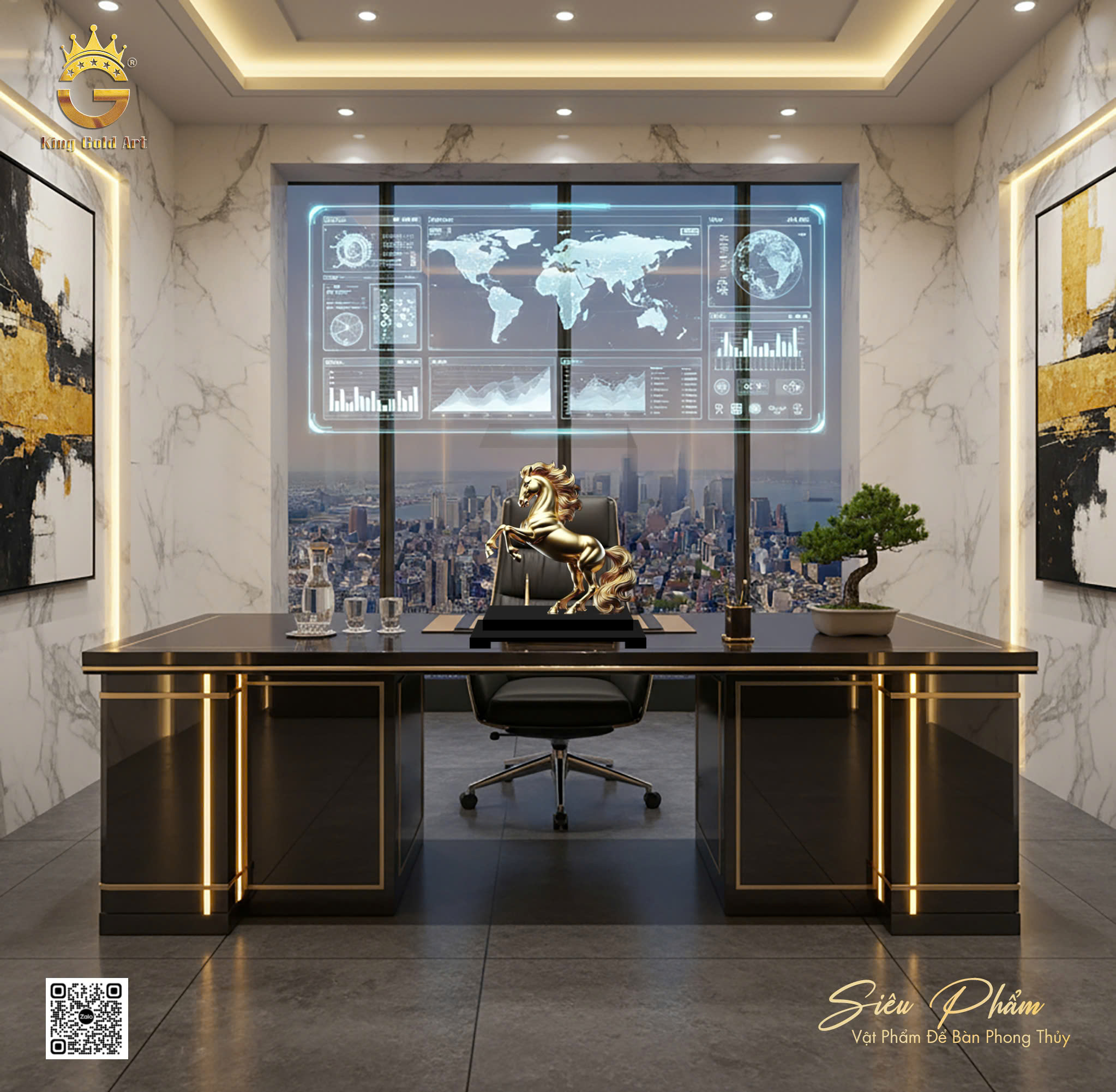 Phòng làm việc: Đặt tượng ngựa Nhất Mã Phi Thiên mạ vàng 24K trên bàn làm việc hoặc tủ sau lưng giúp tăng quyền uy, củng cố vị thế lãnh đạo, và tạo động lực phấn đấu không ngừng.