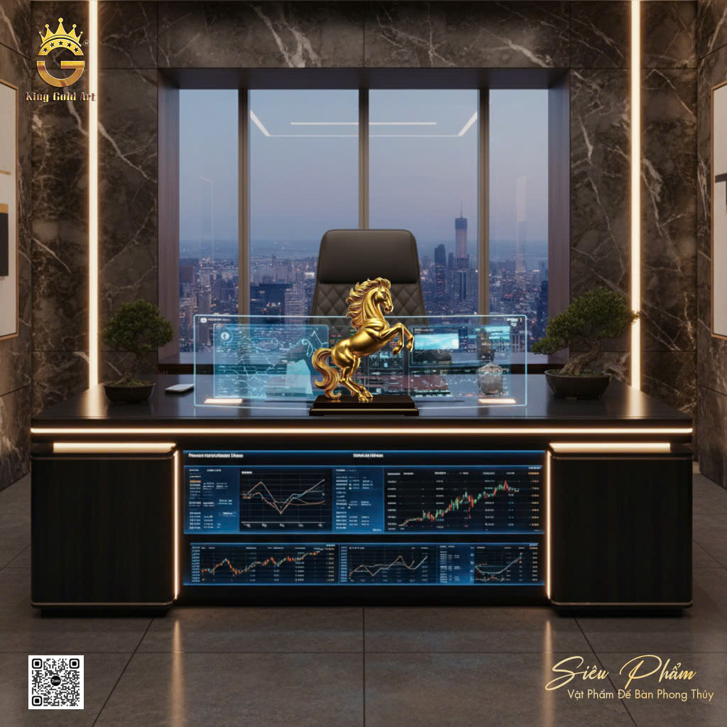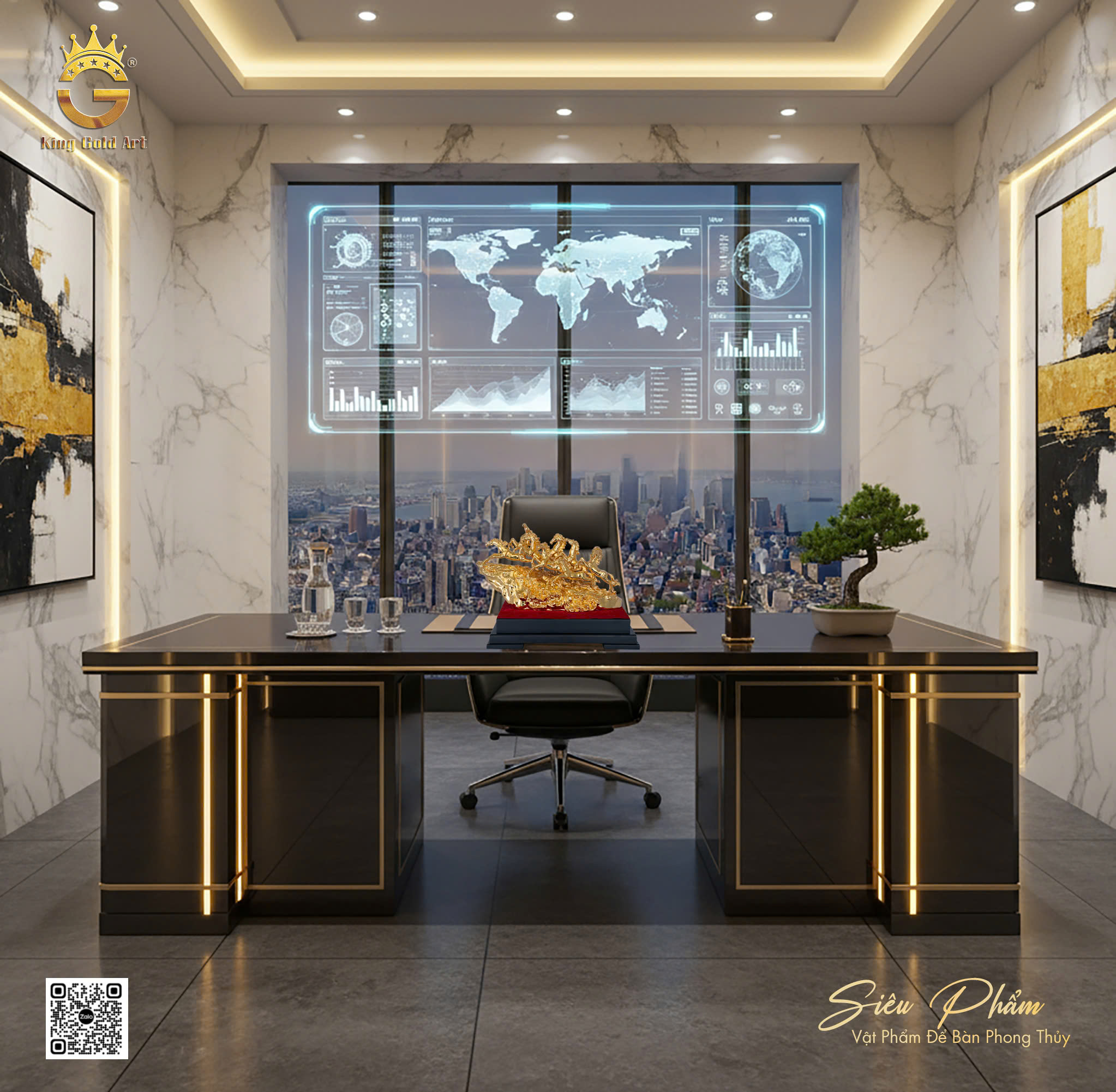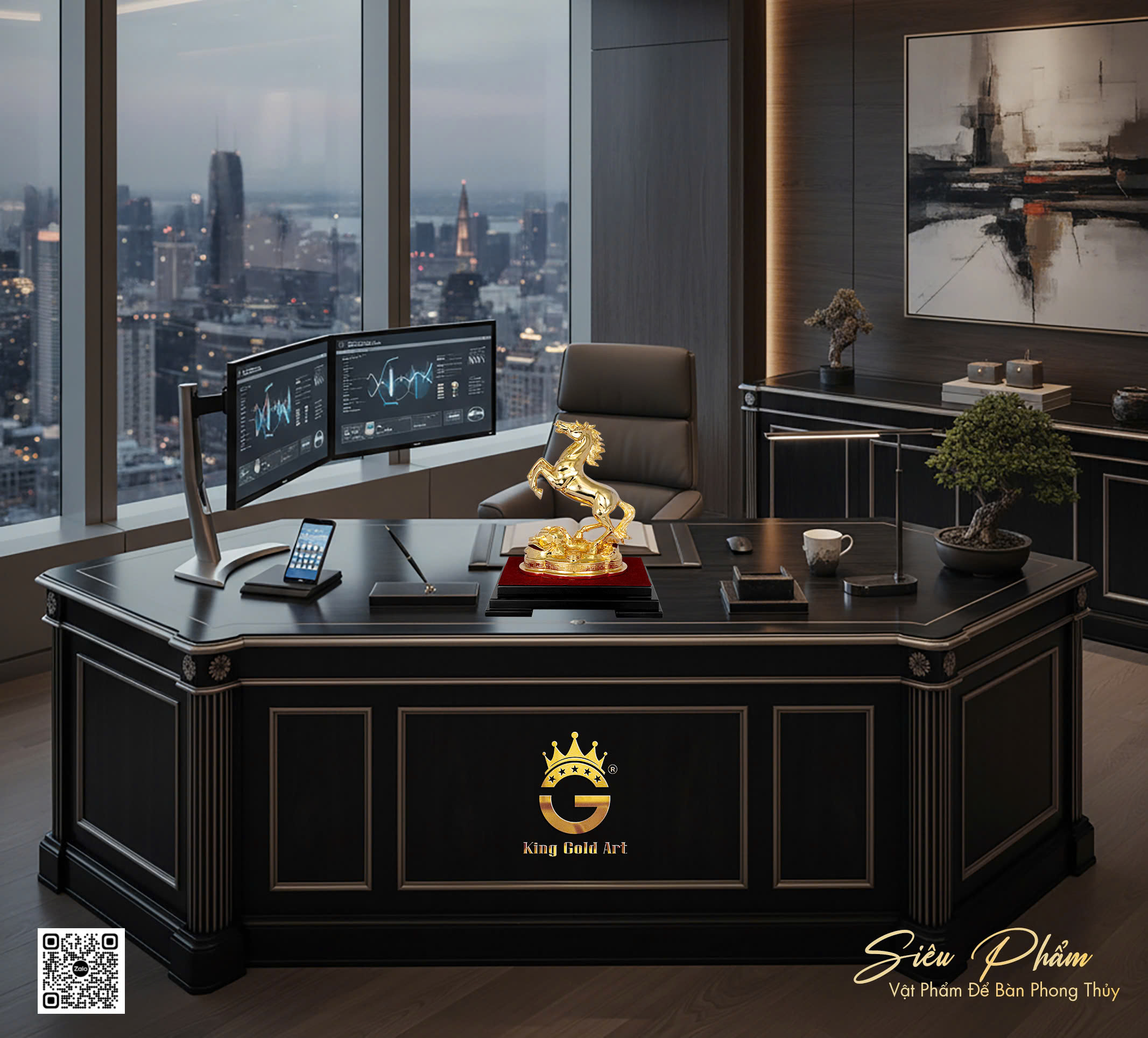 Phòng làm việc: Đặt tượng ngựa Nhất Mã Phi Thiên mạ vàng 24K trên bàn làm việc hoặc tủ sau lưng giúp tăng quyền uy, củng cố vị thế lãnh đạo, và tạo động lực phấn đấu không ngừng.